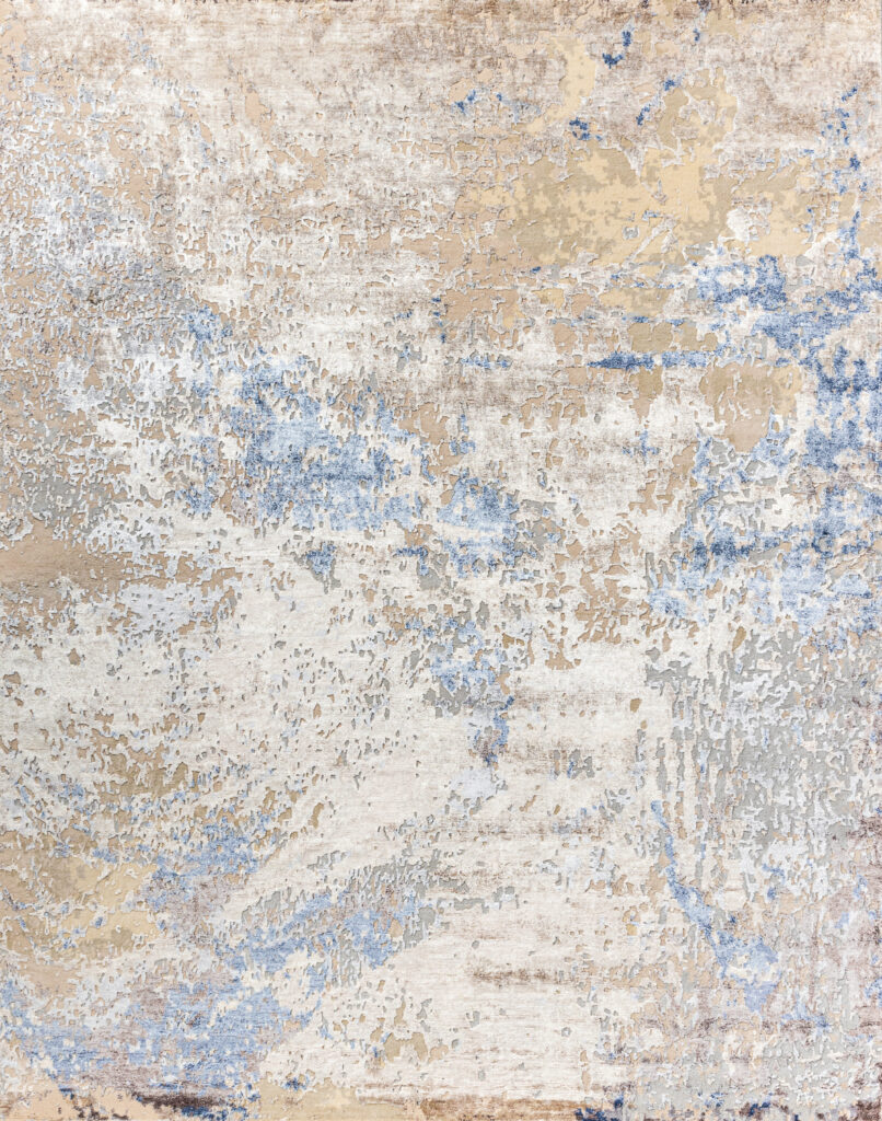 Коллекция ручных ковров из Индии недаром носит название CHROME GOLD. В утончённых абстрактных дизайнах преобладает прохладный оттенок хрома, придающий рисунку блеск и глубину. В него вплетаются ноты лазури, золота и марсала.