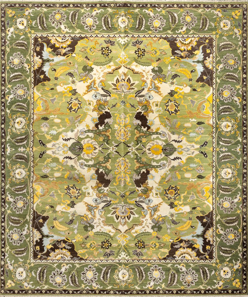 Горделивые узоры из пересекающихся картушей, увитых стеблями, считаются редкими для этого типа ковров, отчего изделия с ними ценятся выше.
