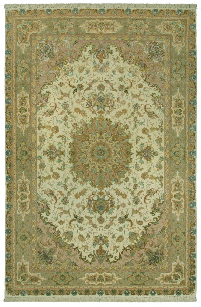Работы мастеров из Тебриза отличаются особой цветовой гаммой – мягкой, с перламутровыми переливами оттенков. Тоначайшие сочетания розового, лазурного, алого и жемчужно-серого на поле цвета слоновой кости создают цветовое богатство и гармонию. Традиционные для персидских ковров цветочные и растительные узоры смотрятся невероятно пластично и придают изделиям дополнительное изящество.