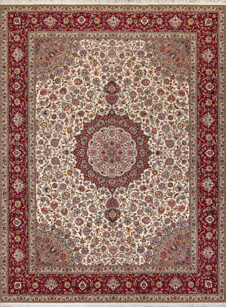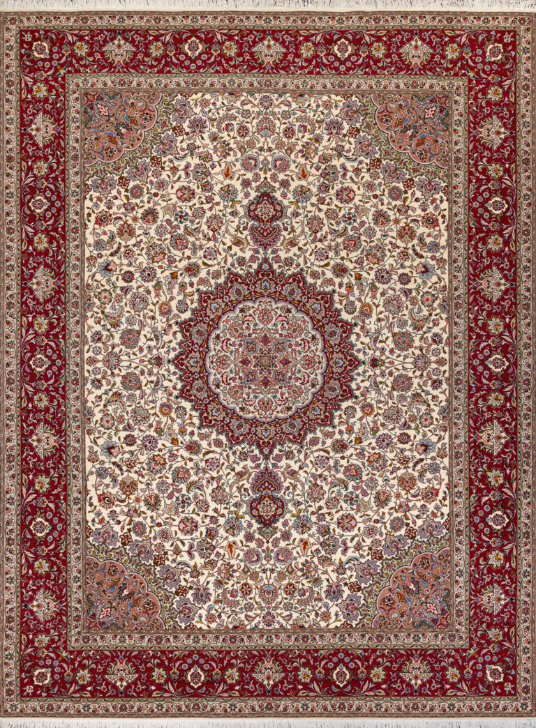 Ковры из города Тебриз 一 это имя, прославленное на весь мир. Именно в этом иранском регионе ткутся, пожалуй, самые элегантные шедевры, сочетающие элементы восточной и европейской культур. Они поражают своей необыкновенной нежностью, изяществом рисунка, изысканной и богатой цветовой гаммой, насчитывающей до 20 цветов в каждом изделии и напоминающей об эпохе рококо. В прошлые века тебризские ковры украшали дворцы иранской шахской знати.