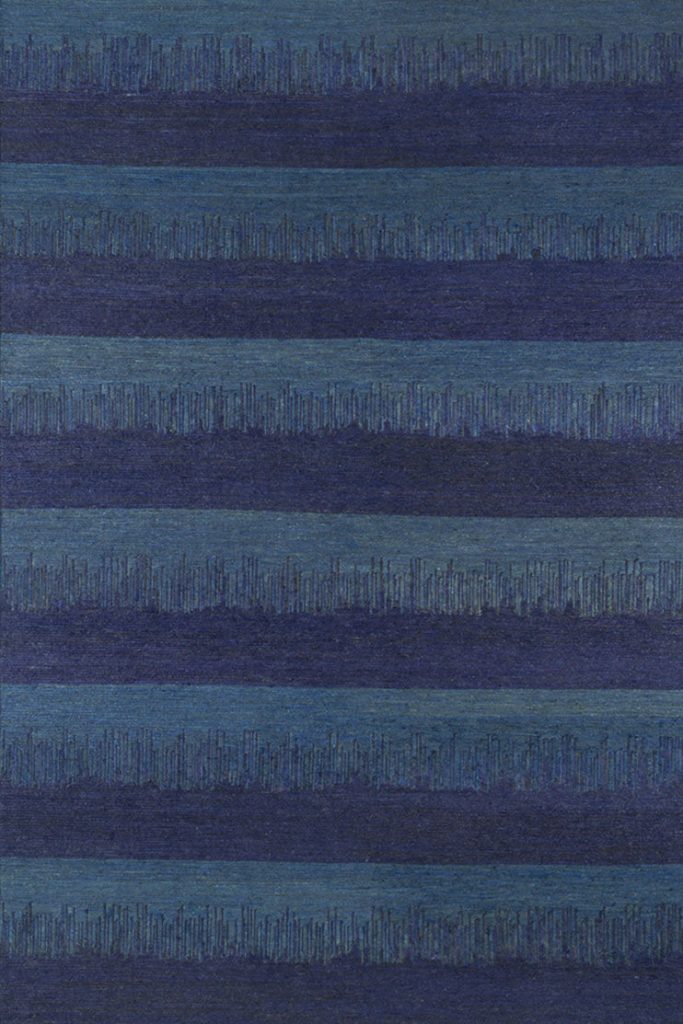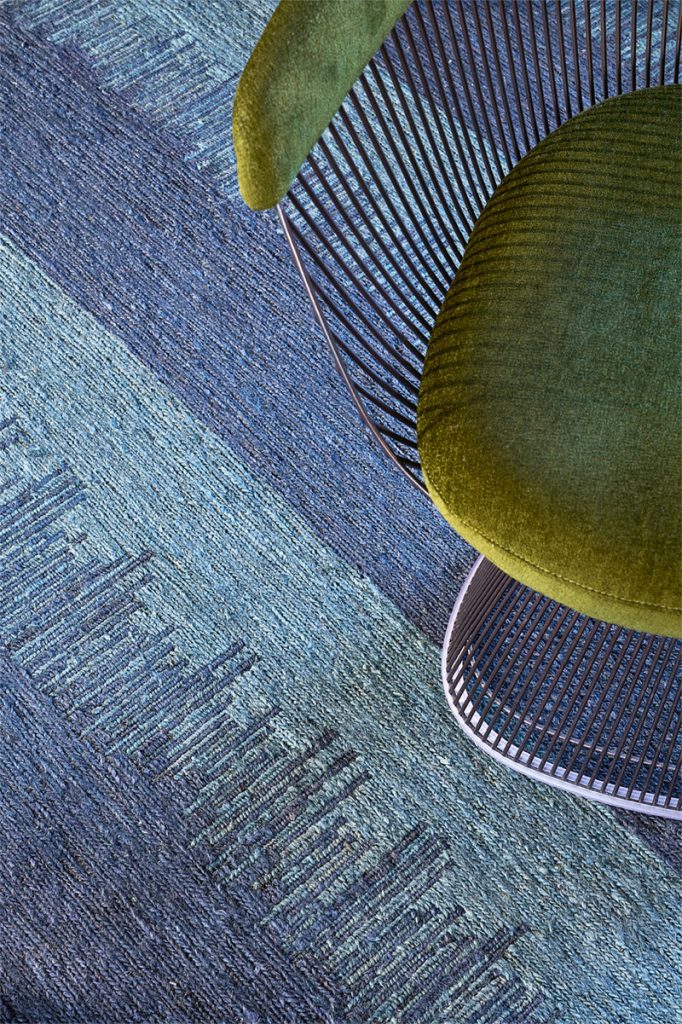 На полу Almonia Blue оживляет пространство тонкими вибрациями, создавая визуальный эффект, меняющийся в зависимости от угла и мощи освещения. Эта уникальная особенность делает ковёр гораздо большим, чем просто напольным покрытием — это действительно «живое» произведение искусства, которое эволюционирует со временем, напоминая мерцающее Балеарское море.