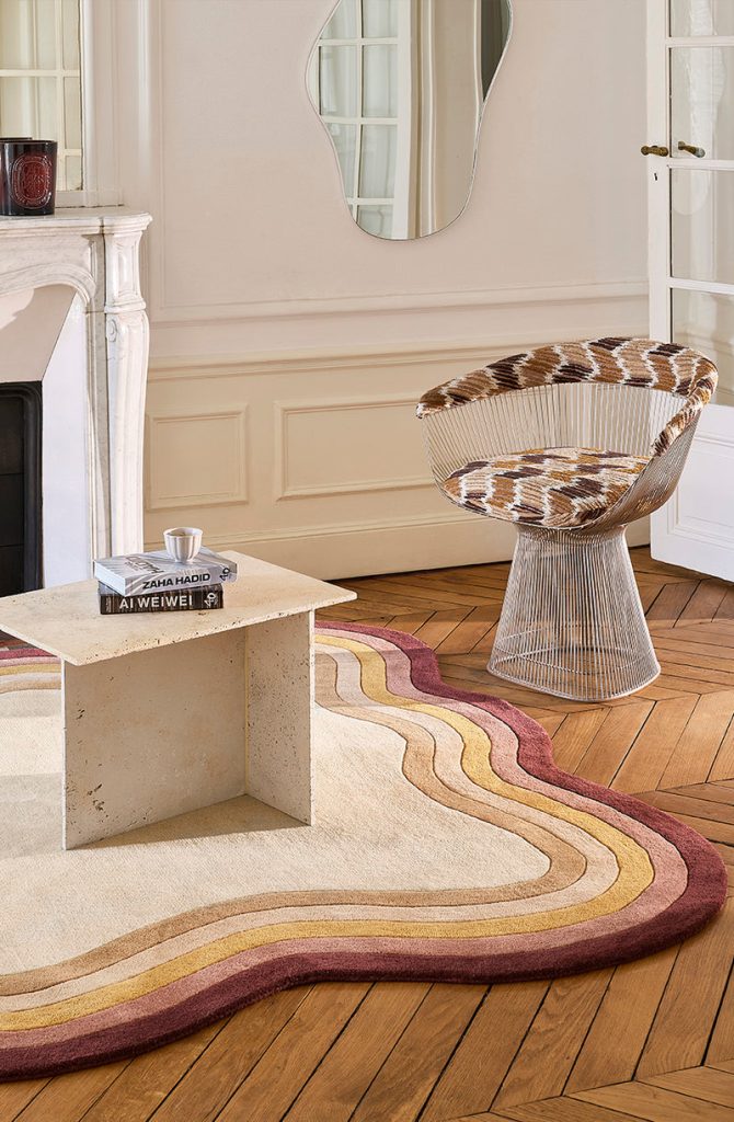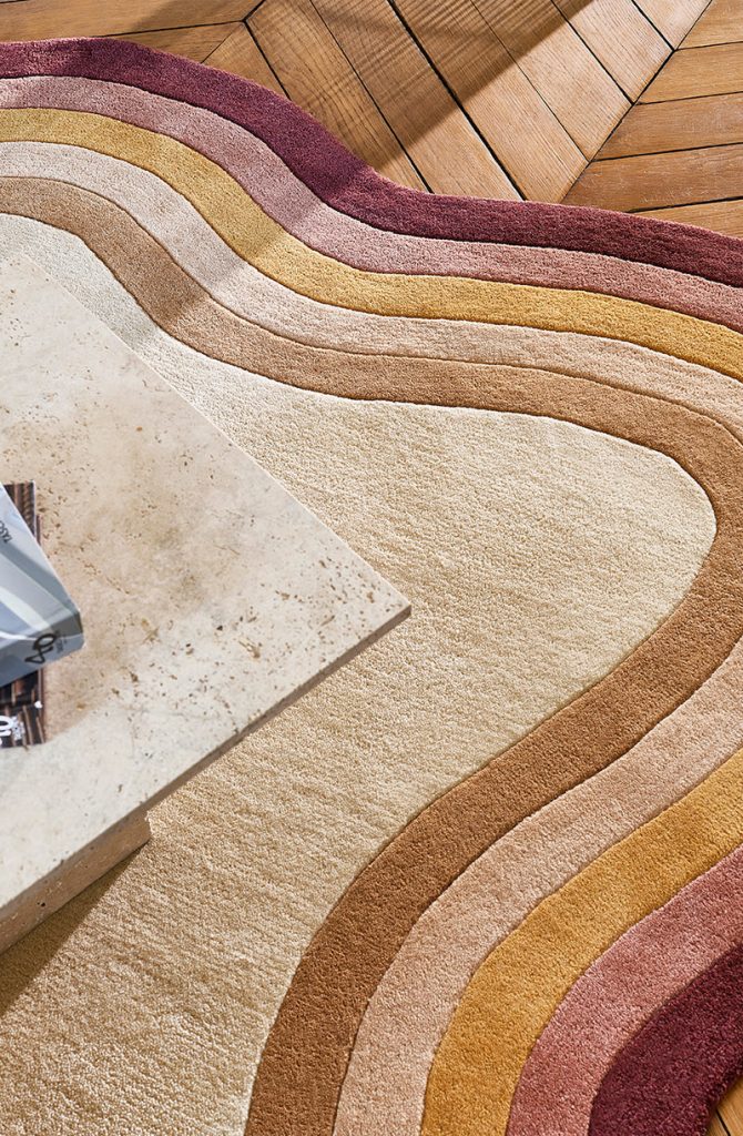 Искусство ручного тафтинга достигает здесь исключительного уровня. Фирменная волнообразная кайма требует абсолютного мастерства в работе с разной высотой ворса — каждая линия вручную вырезается опытнейшими мастерами. Эта уникальная техника формирует индивидуальный характер ковра.