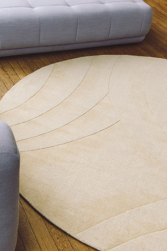 Круглая геометрия Volute переопределяет искусство современного декора. В гостиной с акцентами ар-деко, под столом для приёма гостей или в архитектурном центре помещения, этот ковёр становится фокусной точкой, которая элегантно структурирует пространство. Его бежевые оттенки естественно сочетаются с благородными материалами — прожилковым мрамором, патинированной бронзой или ценными породами древесины.