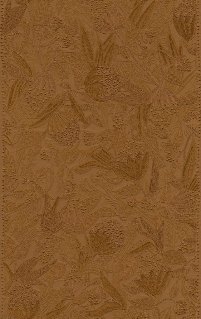 Éclosion — это роскошная ботаническая композиция, вручную вышитая на хлопковой основе. Среди изящных листьев раскрываются элегантные цветы, дополненные тонкими французскими узелками. Название передаёт поэтичный момент распускания бутона — символ рождения красоты. Пышная ботаническая композиция, вручную вышитая на хлопковой основе.