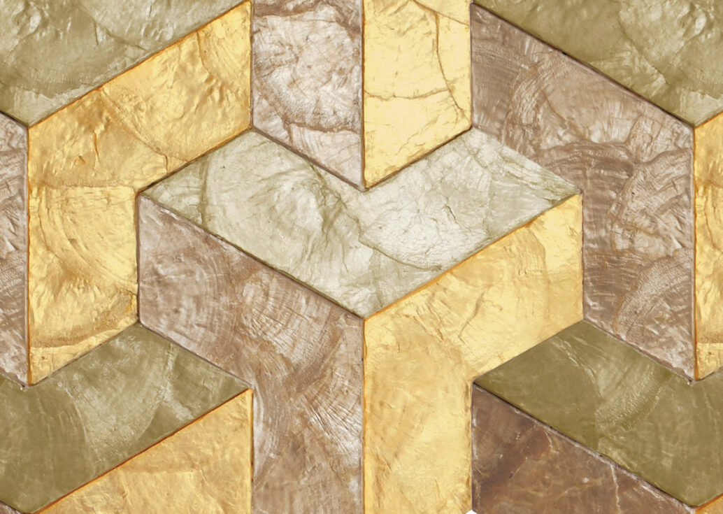Обои из капиза, устричных раковин, которые раскрашиваются, вырезаются и выкладываются в геометрические узоры вручную. Капиз – настоящий натуральный продукт; каждая раковина уникальна и отличается по цвету и структуре.