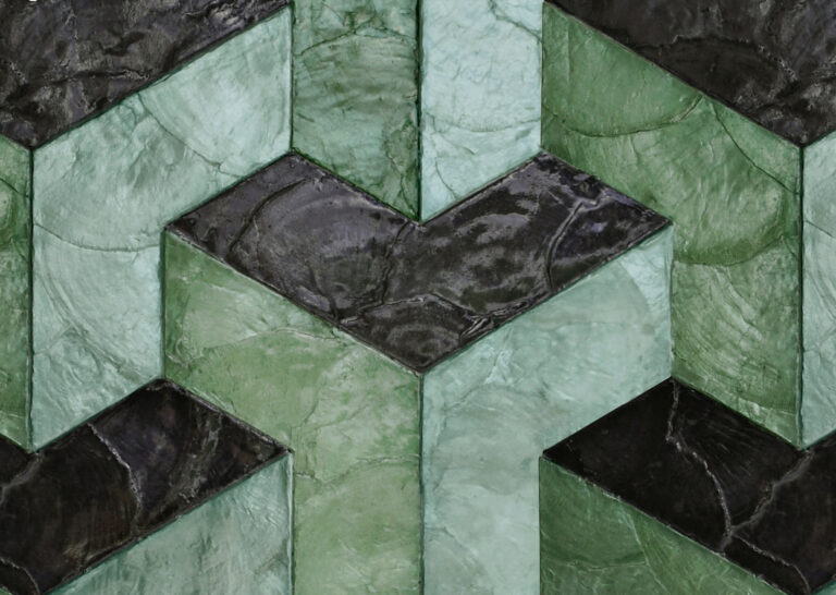 Обои из капиза, устричных раковин, которые раскрашиваются, вырезаются и выкладываются в геометрические узоры вручную. Капиз – настоящий натуральный продукт; каждая раковина уникальна и отличается по цвету и структуре.