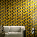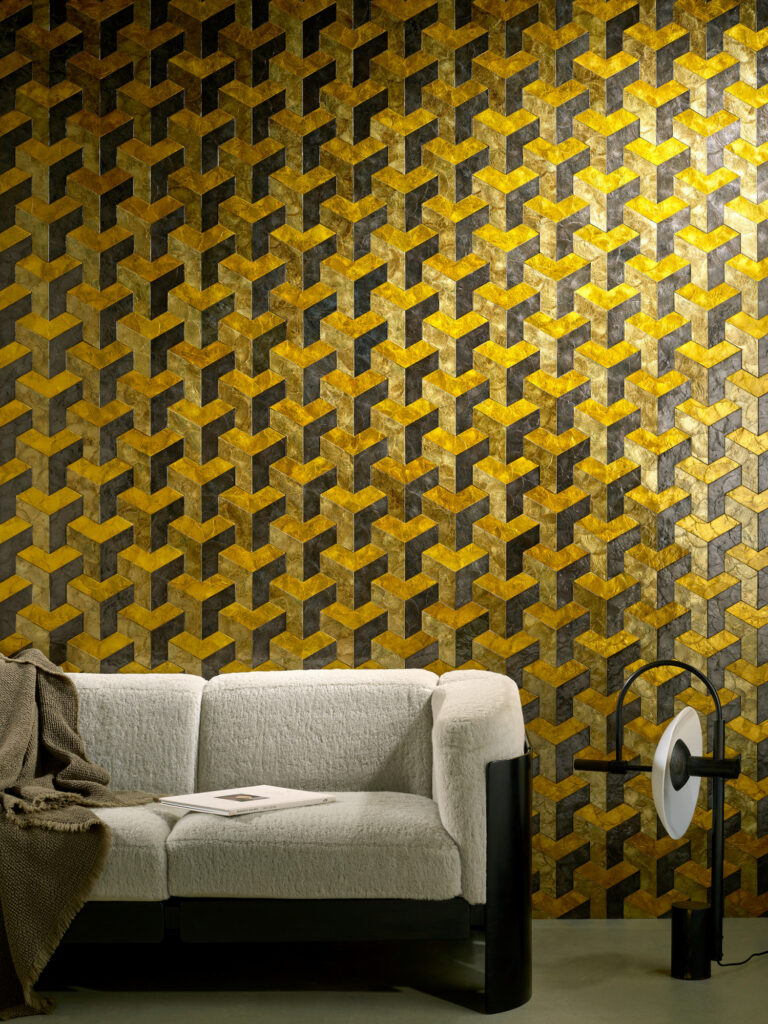 Обои из капиза, устричных раковин, которые раскрашиваются, вырезаются и выкладываются в геометрические узоры вручную. Капиз – настоящий натуральный продукт; каждая раковина уникальна и отличается по цвету и структуре.