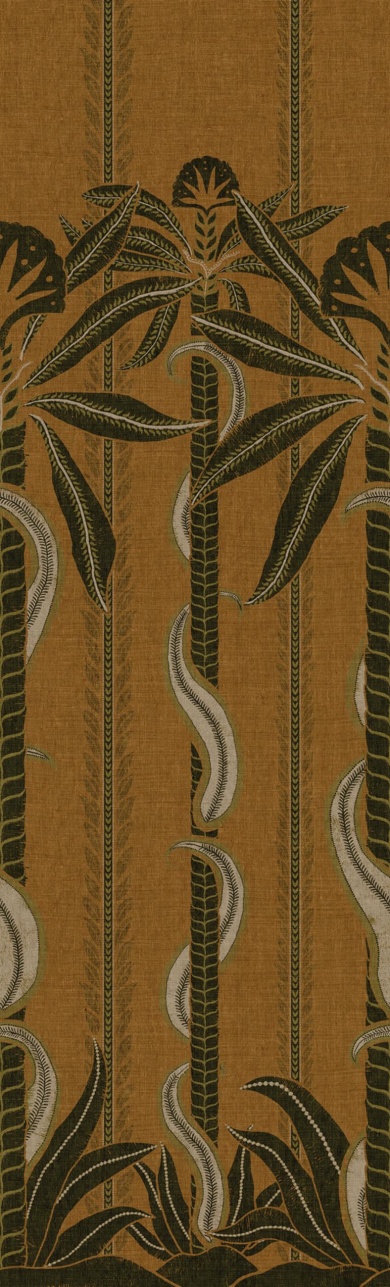 Колышущиеся пальмы вдоль берегов рек индийского штата Керала вдохновили этот панорамный дизайн. Изящные линии особенно выразительно смотрятся на виниловой основе с лёгкой, открытой фактурой льна. Панорамный дизайн с лёгкой фактурой льна с открытым переплетением. Рисунок повторяемый, что позволяет соединять несколько панорам в одно полотно.