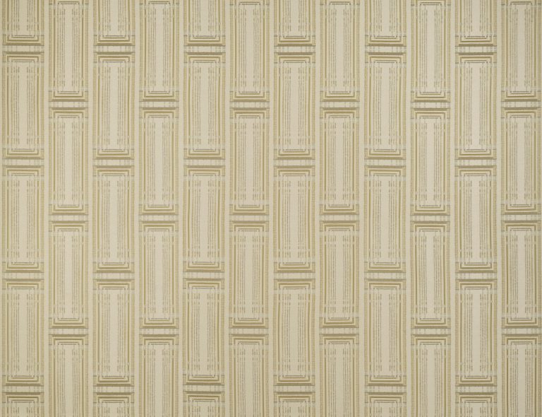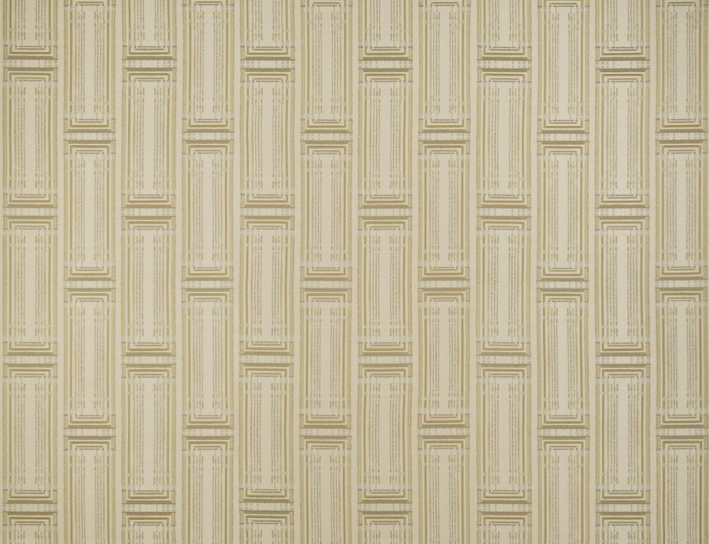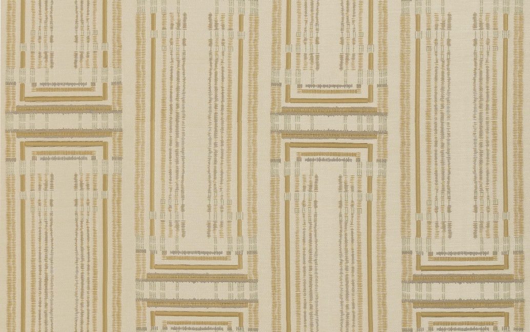 Это выдающееся настенное покрытие в стиле ар-деко сочетает несколько ткацких техник, формируя сложный геометрический дизайн. Часть узора вышита на роскошном жаккарде, а другие элементы выполнены из бархатных аппликаций, создавая глубину и выразительность. Настенное покрытие из жаккардовой ткани в стиле ар-деко, сочетающее вышивку и бархатные аппликации. Текстильное настенное покрытие на флизелиновой основе