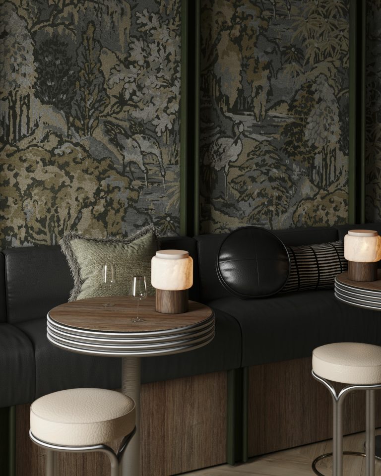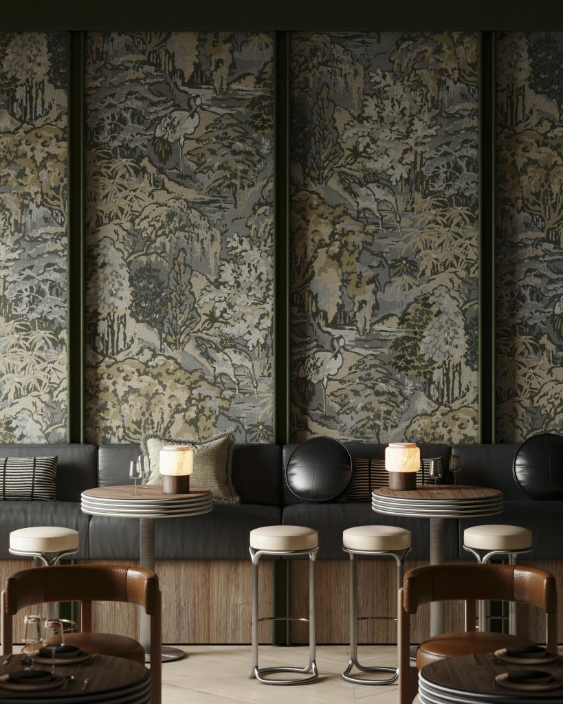Вдохновлённое классическими гобеленами, это жаккардовое тканое настенное покрытие изображает пышный берег реки, из растительности которого выглядывает японский журавль. Этот редкий вид в Японии символизирует удачу и долголетие. Рисунок намеренно выполнен с эффектом пикселизации — отсылка к оптимизму середины XX века. Тканое жаккардовое настенное покрытие, вдохновлённое классическими гобеленами.