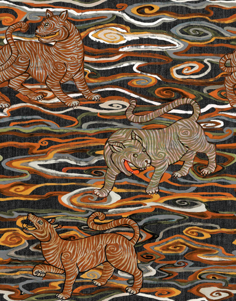 Этот смелый дизайн иллюстрирует тибетских тигров в эклектичной манере. Ковры с тиграми имеют важное значение в Тибете для медитации и защищают от негатива. Уникальный жемчуг на льне сияет благодаря металлическому прикосновению. Здесь есть тонкие отсылки к тибетской культуре.
