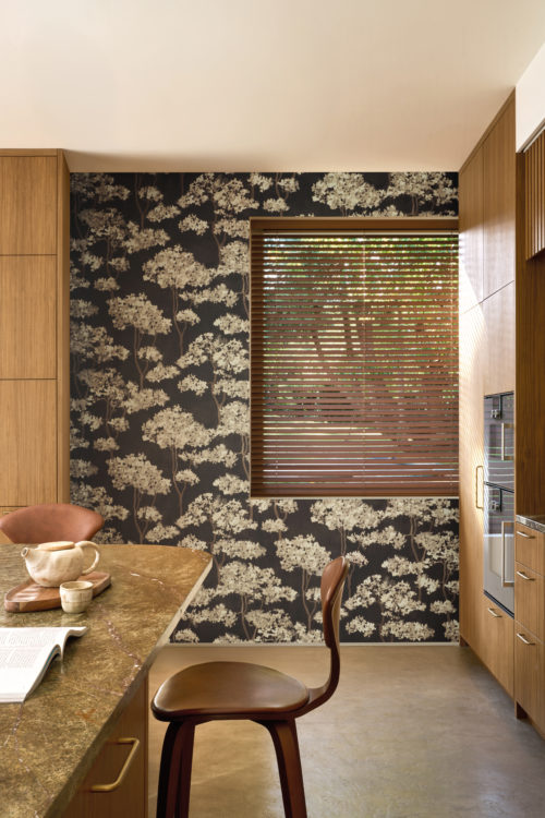 Обои со стилизованным растительным орнаментом с деликатным блеском, придающим поверхности изысканный декоративный эффект.