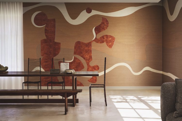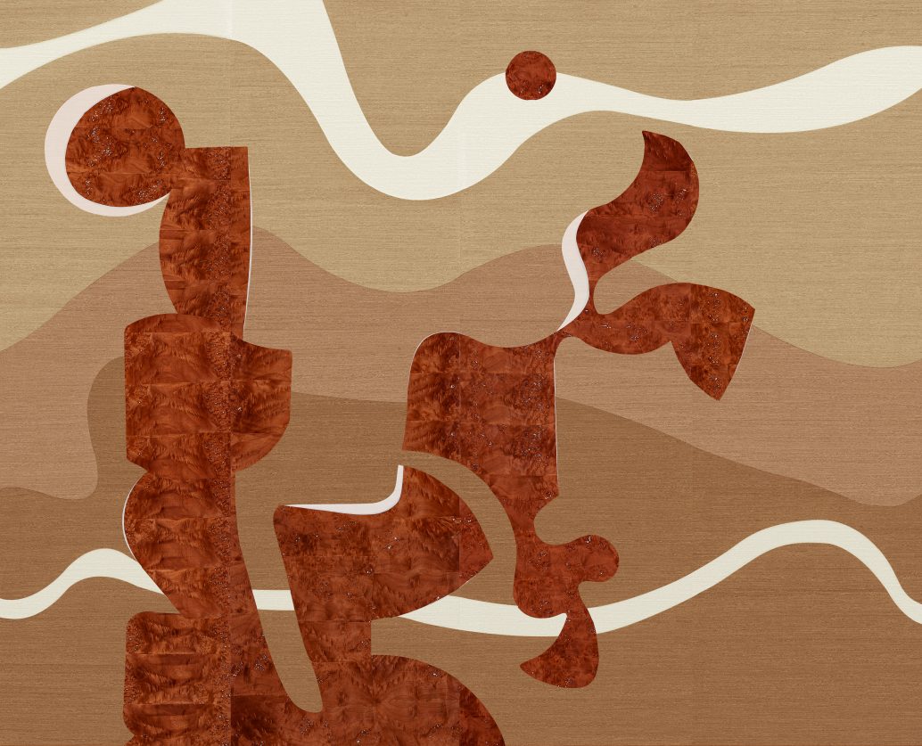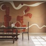 Обои с органичным рисунком под каповое дерево, продолжающим панно в единую цельную композицию, создающую эффект цельного природного пейзажа.