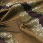 Жаккардовая ткань — ткань с крупным узором, сложного переплетения. Ткань прочна и долговечна. Широкие полосы коричневого. Цветы серебряного цвета.